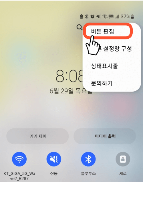 - 빠른 설정 창에서 오른쪽 상단의 점 세 개를 누르고 '버튼 편집'을 선택하세요.